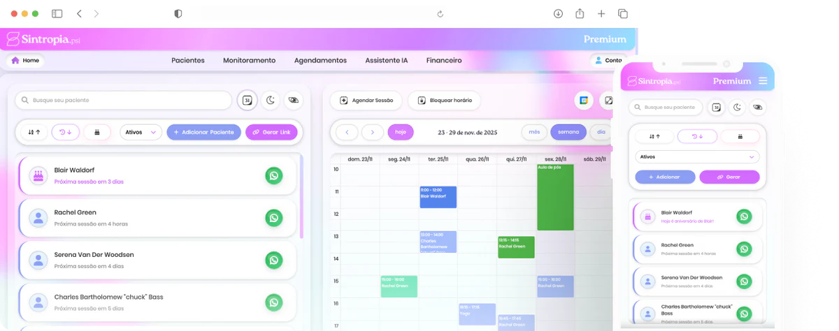 Envie lembretes e receba confirmações de sessão direto no WhatsApp — menos faltas, agenda mais organizada e faturamento mais previsível.